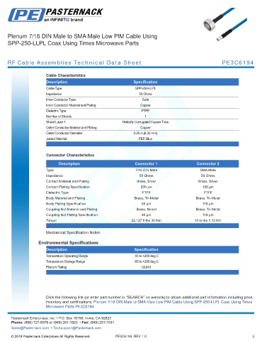 inventory and certifications: Plenum 7/16 DIN Male to SMA Male Low PIM Cable Using SPP-250-LLPL Coax Using Times
