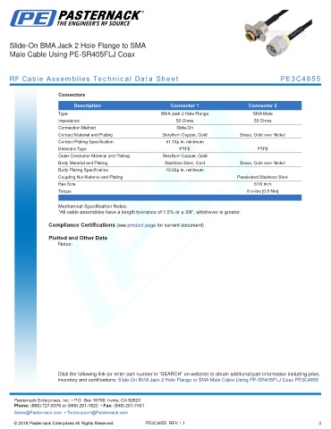 inventory and certifications: Slide-On BMA Jack 2 Hole Flange to SMA Male Cable Using PE-SR405FLJ Coax PE3C4855