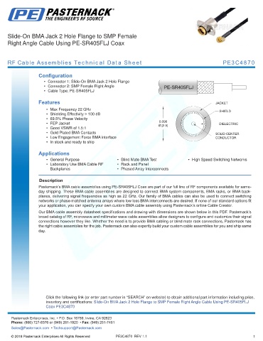 inventory and certifications: Slide-On BMA Jack 2 Hole Flange to SMP Female Right Angle Cable Using PE-SR405FLJ
