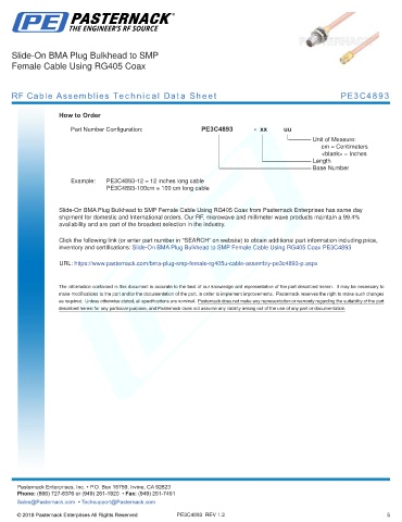 any representation or warranty regarding the suitability of the part described herein for any particular purpose, and Pasternack does not assume any liability arising out of the use of any part or documentation.