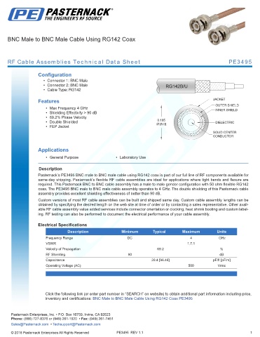 Pasternack’s PE3495 BNC male to BNC male cable using RG142 coax is part of our full line of RF components available for