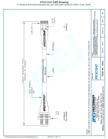 PE3C3247 CAD Drawing N Female to N Female Bulkhead Low Loss Test Cable Using PE-P300LL Coax, RoHS PE3C3247 REV 1.0 5