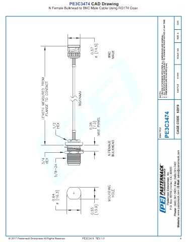 PE3C3474 CAD Drawing N Female Bulkhead to BNC Male Cable Using RG174 Coax PE3C3474 REV 1.0 4