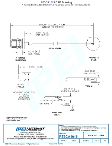 PE3CA1015 CAD Drawing N Female Bulkhead to HMCX32 1.2 Plug Cable Using 0.81mm Coax, RoHS PE3CA1015 REV 1.1 4