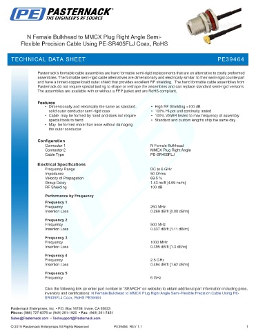 inventory and certifications: N Female Bulkhead to MMCX Plug Right Angle Semi-Flexible Precision Cable Using PE-