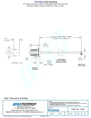 PE39464 CAD Drawing N Female Bulkhead to MMCX Plug Right Angle Semi-Flexible Precision Cable Using PE-SR405FLJ Coax, RoHS PE39464 REV 1.1 4