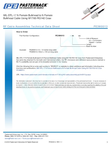 any representation or warranty regarding the suitability of the part described herein for any particular purpose, and Pasternack does not assume any liability arising out of the use of any part or documentation.