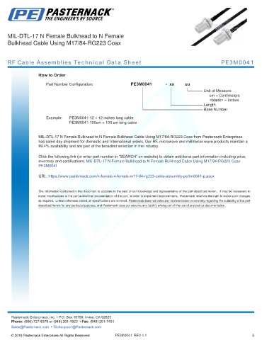 any representation or warranty regarding the suitability of the part described herein for any particular purpose, and Pasternack does not assume any liability arising out of the use of any part or documentation.