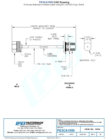 PE3CA1050 CAD Drawing N Female Bulkhead to N Male Cable Using PE-141FLEX Coax, RoHS PE3CA1050 REV 1.1 6