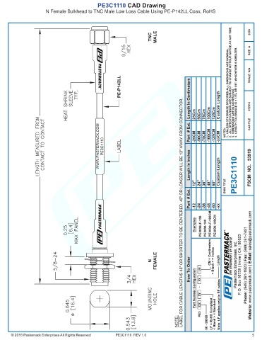 PE3C1110 CAD Drawing N Female Bulkhead to TNC Male Low Loss Cable Using PE-P142LL Coax, RoHS PE3C1110 REV 1.0 5