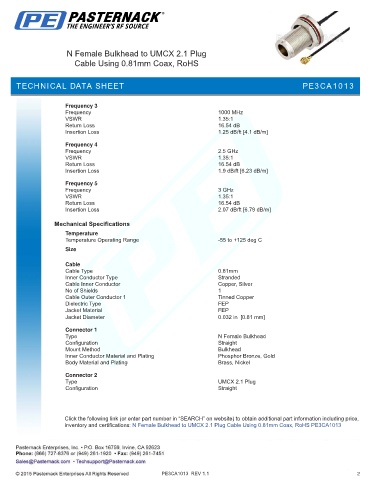 inventory and certifications: N Female Bulkhead to UMCX 2.1 Plug Cable Using 0.81mm Coax, RoHS PE3CA1013