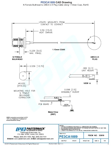 PE3CA1009 CAD Drawing N Female Bulkhead to UMCX 2.5 Plug Cable Using 1.13mm Coax, RoHS PE3CA1009 REV 1.1 4