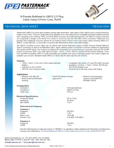 inventory and certifications: N Female Bulkhead to UMCX 2.5 Plug Cable Using 0.81mm Coax, RoHS PE3CA1008