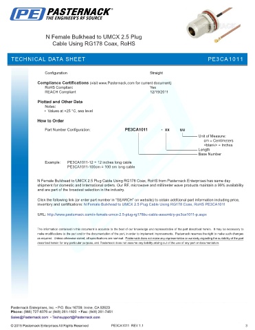inventory and certifications: N Female Bulkhead to UMCX 2.5 Plug Cable Using RG178 Coax, RoHS PE3CA1011
