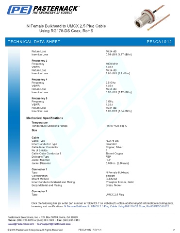 inventory and certifications: N Female Bulkhead to UMCX 2.5 Plug Cable Using RG178-DS Coax, RoHS PE3CA1012