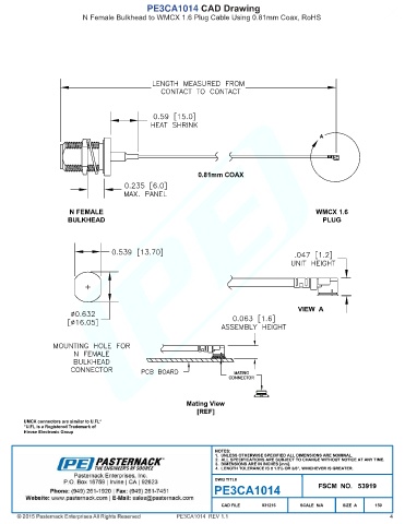 PE3CA1014 CAD Drawing N Female Bulkhead to WMCX 1.6 Plug Cable Using 0.81mm Coax, RoHS PE3CA1014 REV 1.1 4