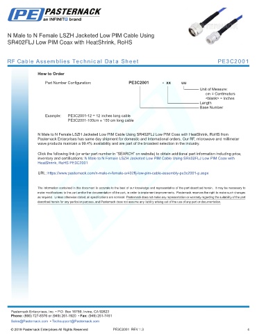 any representation or warranty regarding the suitability of the part described herein for any particular purpose, and Pasternack does not assume any liability arising out of the use of any part or documentation.