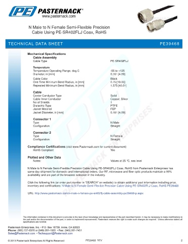 inventory and certifications: N Male to N Female Semi-Flexible Precision Cable Using PE-SR402FLJ Coax, RoHS PE39468