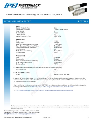 inventory and certifications: N Male to N Female Cable Using 1/2 inch Helical Coax, RoHS PE37969