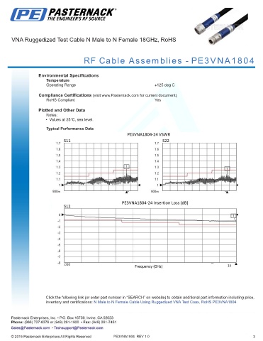 inventory and certifications: N Male to N Female Cable Using Ruggedized VNA Test Coax, RoHS PE3VNA1804
