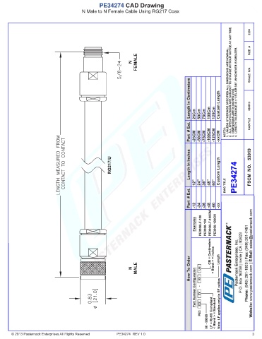 PE34274 CAD Drawing N Male to N Female Cable Using RG217 Coax © 2013 Pasternack Enterprises All Rights Reserved PE34274 REV 1.0 3