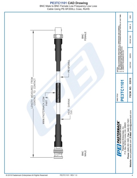 PE3TC1101 CAD Drawing BNC Male to BNC Female Low Frequency Low Loss Cable Using PE-SF200LL Coax, RoHS PE3TC1101 REV 1.0 4