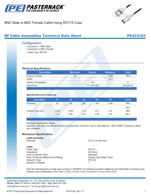 inventory and certifications: BNC Male to BNC Female Cable Using RG174 Coax PE3C3325