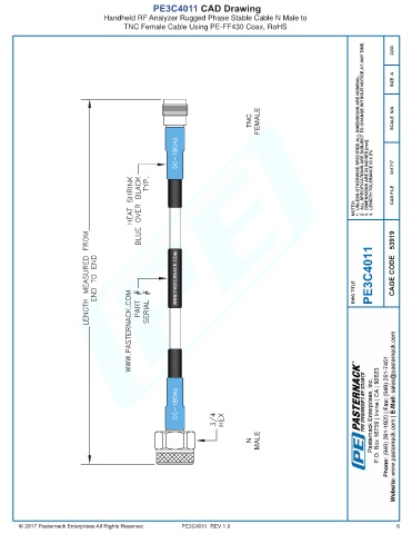 PE3C4011 CAD Drawing Handheld RF Analyzer Rugged Phase Stable Cable N Male to TNC Female Cable Using PE-FF430 Coax, RoHS PE3C4011 REV 1.0 6