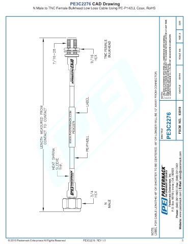 PE3C2276 CAD Drawing N Male to TNC Female Bulkhead Low Loss Cable Using PE-P142LL Coax, RoHS PE3C2276 REV 1.0 5