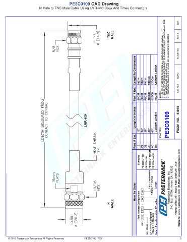 PE3C0109 CAD Drawing N Male to TNC Male Cable Using LMR-400 Coax And Times Connectors © 2013 Pasternack Enterprises All Rights Reserved PE3C0109 REV 3