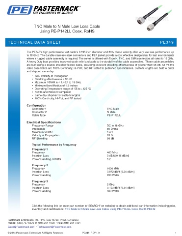 inventory and certifications: TNC Male to N Male Low Loss Cable Using PE-P142LL Coax, RoHS PE349