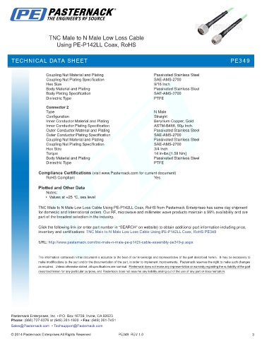 inventory and certifications: TNC Male to N Male Low Loss Cable Using PE-P142LL Coax, RoHS PE349