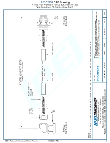 PE3C2953 CAD Drawing N Male Right Angle to N Female Bulkhead Low Loss Test Cable Using PE-P300LL Coax, RoHS PE3C2953 REV 1.0 5