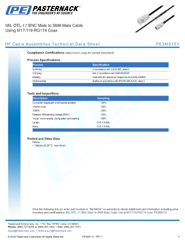 inventory and certifications: MIL-DTL-17 BNC Male to SMA Male Cable Using M17/119-RG174 Coax PE3M0101