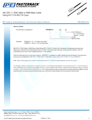inventory and certifications: MIL-DTL-17 BNC Male to SMA Male Cable Using M17/119-RG174 Coax PE3M0101