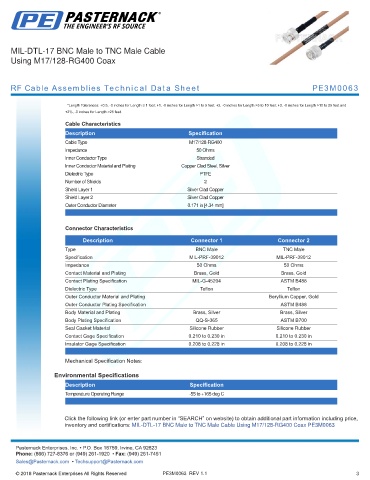 inventory and certifications: MIL-DTL-17 BNC Male to TNC Male Cable Using M17/128-RG400 Coax PE3M0063