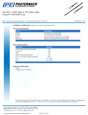 inventory and certifications: MIL-DTL-17 BNC Male to TNC Male Cable Using M17/28-RG58 Coax PE3M0118