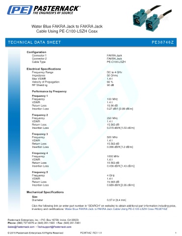 inventory and certifications: Water Blue FAKRA Jack to FAKRA Jack Cable Using PE-C100-LSZH Coax PE38746Z