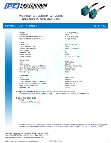 inventory and certifications: Water Blue FAKRA Jack to FAKRA Jack Cable Using PE-C100-LSZH Coax PE38746Z