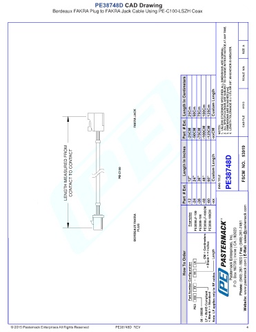 PE38748D CAD Drawing Bordeaux FAKRA Plug to FAKRA Jack Cable Using PE-C100-LSZH Coax 41613 FAKRA JACK LENGTH MEASURED FROM CONTACT TO CONTACT PE-C100 PE38748D BORDEAUX FAKRA PLUG PE38748D REV 4