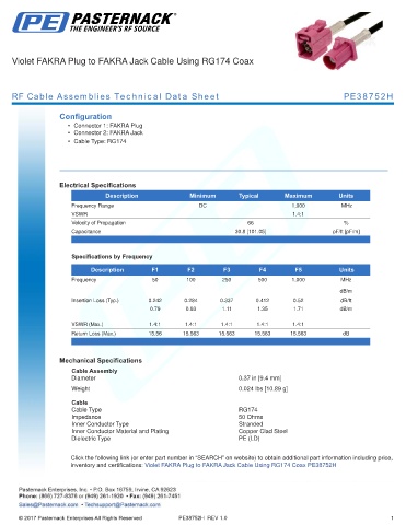 inventory and certifications: Violet FAKRA Plug to FAKRA Jack Cable Using RG174 Coax PE38752H