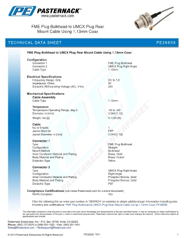 inventory and certifications: FME Plug Bulkhead to UMCX Plug Rear Mount Cable Using 1.13mm Coax PE38858