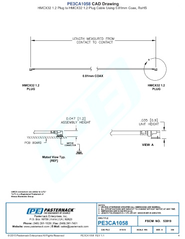 PE3CA1058 CAD Drawing HMCX32 1.2 Plug to HMCX32 1.2 Plug Cable Using 0.81mm Coax, RoHS PE3CA1058 REV 1.1 4