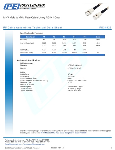 inventory and certifications: MHV Male to MHV Male Cable Using RG141 Coax PE34429
