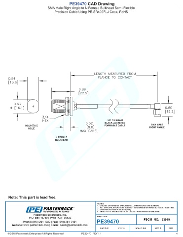 PE39470 CAD Drawing SMA Male Right Angle to N Female Bulkhead Semi-Flexible Precision Cable Using PE-SR402FLJ Coax, RoHS PE39470 REV 1.1 4