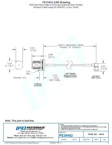 PE39462 CAD Drawing SMA Male Right Angle to N Female Bulkhead Semi-Flexible Precision Cable Using PE-SR405FLJ Coax, RoHS PE39462 REV 1.1 4