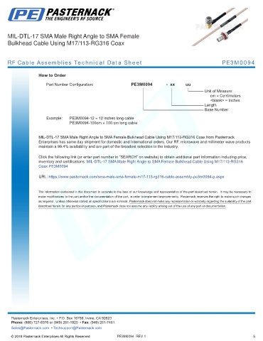 any representation or warranty regarding the suitability of the part described herein for any particular purpose, and Pasternack does not assume any liability arising out of the use of any part or documentation.