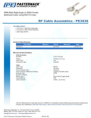 inventory and certifications: SMA Male Right Angle to SMA Female Bulkhead Cable Using RG316 Coax PE3836