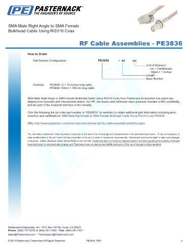 inventory and certifications: SMA Male Right Angle to SMA Female Bulkhead Cable Using RG316 Coax PE3836