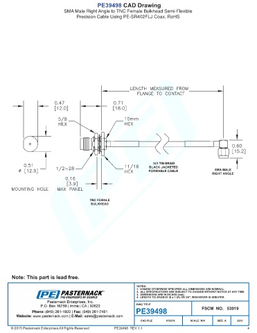 PE39498 CAD Drawing SMA Male Right Angle to TNC Female Bulkhead Semi-Flexible Precision Cable Using PE-SR402FLJ Coax, RoHS PE39498 REV 1.1 4